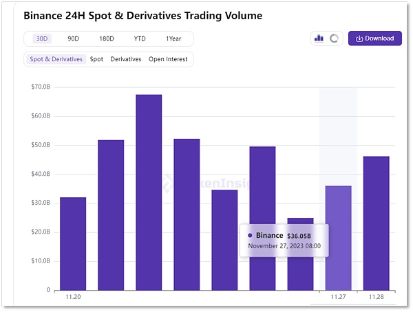 此外,Tokeninsight的数据显示,币安的24小时现货及衍生品交易量在过去一周内保持了稳定,11月27日为360.5亿美元。