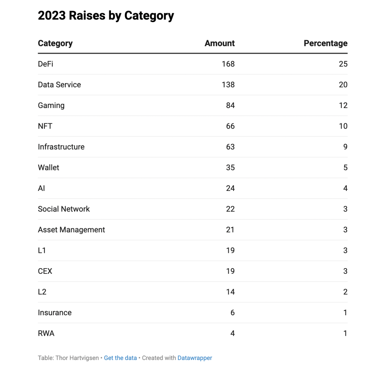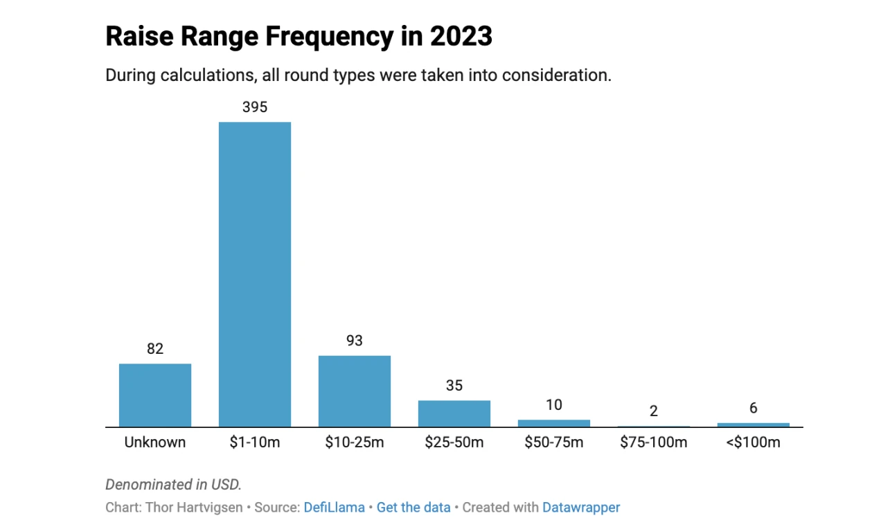 时势艰难,因为 2023 年的市场状况不如前两年,流动性难以获得,投资者不愿意承担额外风险。大多数项目获得资金的范围在 100 万至 1000 万美元之间,只有少数成熟的项目筹集到 5000 万美元或更多。