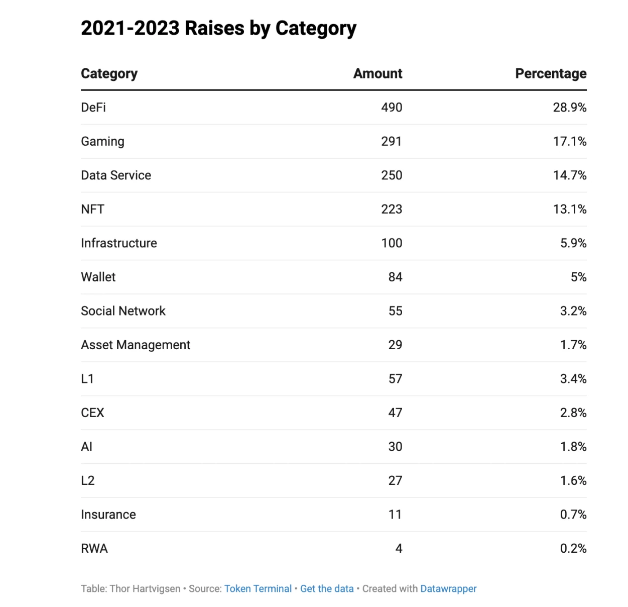 DeFi 是融资最多的类别,融资额最大的项目集中在 L1 和 L2 区块链。