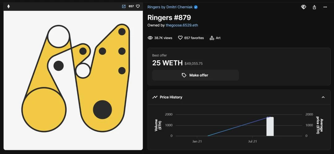 为什么是鹅(Goose)?这里首先不得不提到 Dmitri Cherniak 的著名生成艺术作品 Ringers,当前地板价超过 40 ETH,其中最具代表性的当属 Ringers 879 ,因在不规则图形的堆叠中出现了“鹅”的元素,也被冠以绰号“Goose”。Ringers 879 曾被已经破产的 3AC 以 1, 800 ETH 购买,但后来破产清算中被以 600 万美元拍卖。