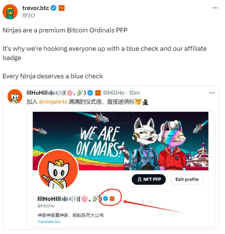 trevor 还给所有铸造者整了一个「Twitter 勋章大礼包」。现在已经挑好自己 Pizza Ninjas 形象的铸造者,都会被邀请成为 Ninjalerts 的附属账号,相当于免费给大家送 Twitter Premium+ 服务,一个蓝标 + 一个 Twitter 上的 Pizza Ninjas 勋章。