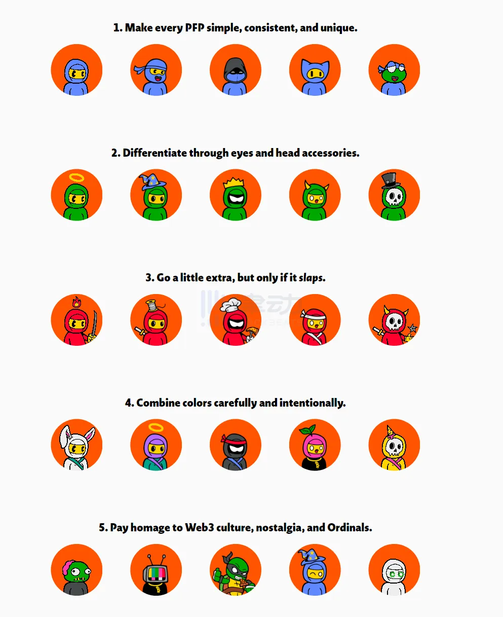 6. 向 Web3 文化、怀旧文化以及 Ordinals 文化致敬(可以看到图中出现了 Kevin 、电视头、忍者神龟、巫师帽、OMB 这些元素)