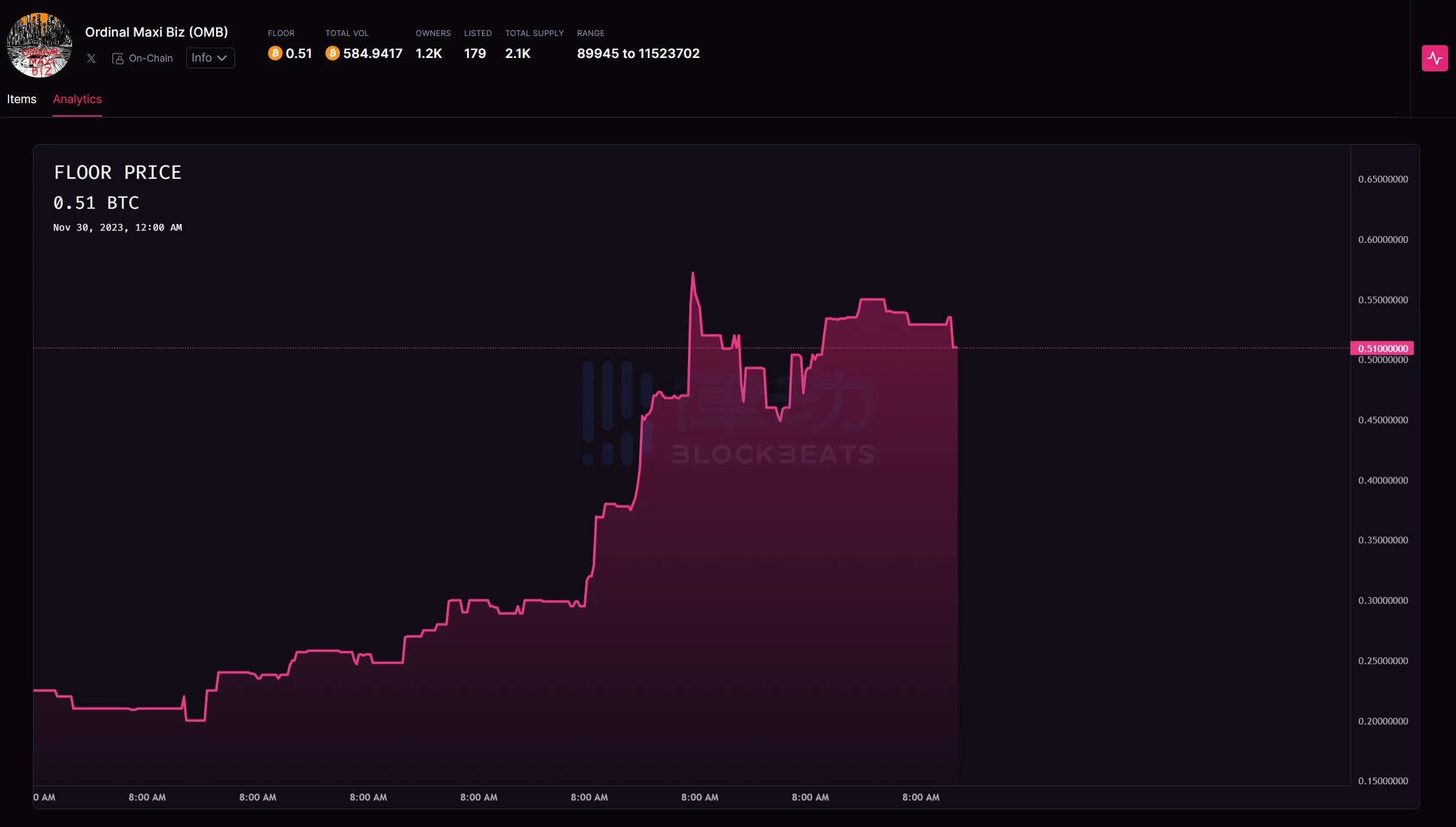 在 Bitcoin Frogs、Goosinals 等以国人为主力的 10 K 比特币 NFT 系列行情遇冷后,OMB( Ordinals Maxi Biz) 这样在英文圈有着巨大影响力、总供应量较低的比特币 NFT 项目得到了更多的关注。OMB 的行情启动在 10 K 热潮之后,从 0.2 比特币左右一路上涨到了 0.5+ 比特币并且仍然保持稳定。
