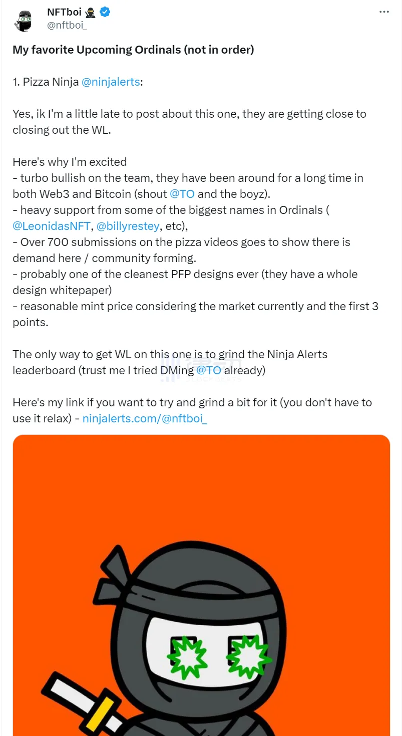 现在依然有机会获取 Pizza Ninjas 的白名单,获取方法是前往 https://www.ninjalerts.com/ordinals,连接 Xverse 钱包和 Twitter 账号后完成给定的任务赢得积分,积分前 1000 名的用户可以获得白名单。