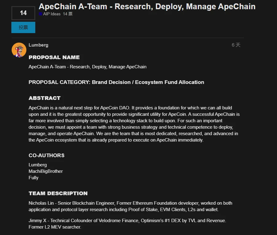 原文中提到了一个名为"ApeChain"的提案,其目标是在 ApeCoin DAO 生态系统中推动研究、部署和管理 ApeChain(原文见扩展链接【 3 】)。文中表述了团队与多个技术解决方案合作伙伴会面并讨论了每个技术解决方案的优势和弱点,以寻求每个合作伙伴的支持。经过项目方团队的深思熟虑选择了支持 Layer 2 Rollups,以此更好的吸引开发者在 ApeChain 上进行构建。