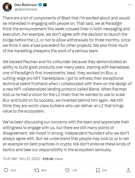 Paradigm 强调他们已经与 Blast 团队进行了讨论,表达了他们的担忧,而团队也表现出愿意与他们交流。这表明在困难或分歧出现时,双方愿意通过对话来解决问题。