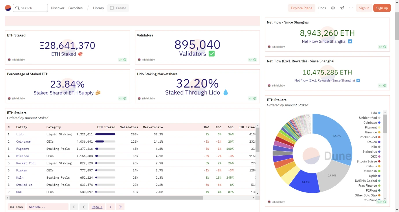 资金中心化: Lido 的代币发行和质押可能受到一些大额持有者的控制,他们有可能在协议上产生不成比例的影响,如下图 Dune 的数据所示, 11 月 29 日:以太坊信标链质押总量超 2864 万枚 ETH, Lido 市占率达 32.20% ;