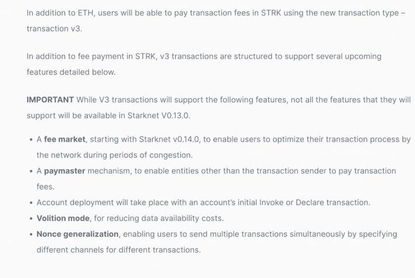 Starknet 正在构建的 V3 交易结构中,将支持以 STRK 支付交易费用。V3 交易结构还将支持以下功能(并非都在 Starknet V 0.13.0 中可用):