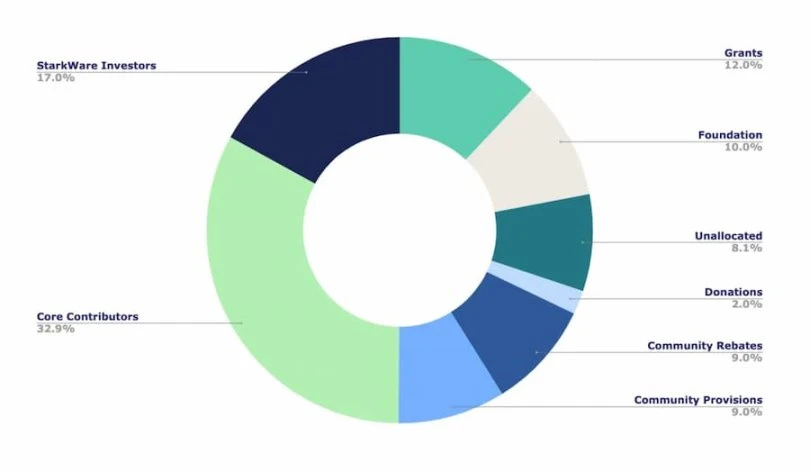 9% 用作社区回扣(用于部分支付从以太坊加入 Starknet 的费用);12% 用于资助开发、测试、部署和维护 Starknet 协议的研究和工作;