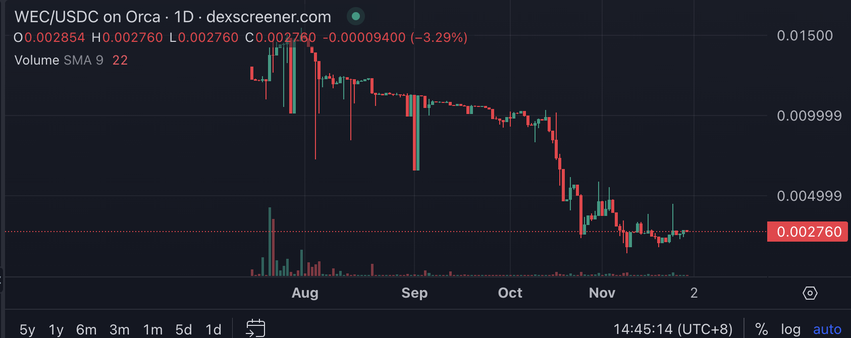 WEC 在应用内也有燃烧机制,像升级、跳过冷却时间等操作,均会导致 WEC 的销毁。但缺乏用例是 WEC 的缺点之一,仅靠游戏的销毁机制,可能并赶不上代币的生产,且初始代币的分配过多,初始代币的分配过多也带来了一定的抛压,这反映在来价格图表上。