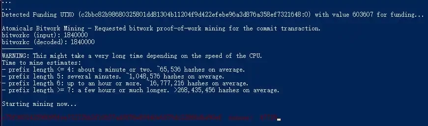 首先是 Bitwork 挖矿,这是 Atomicals 协议独有的公平发射方式, 部署者可以为铸造设定一个特定长度的前缀,铸造者必须使用电脑通过穷举的方式,碰撞出匹配特定前缀的 hash 值后,才能进行铸造。