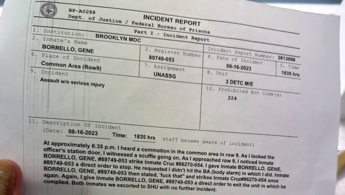 一份监狱事故报告称,Gene Borrello 两次殴打了一名叫 Kevin Cruz 的囚犯,两人都被带到单独监禁室。