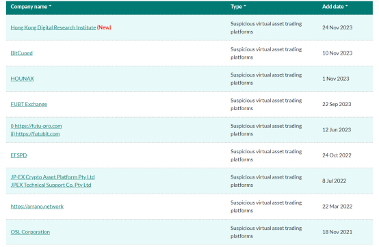 目前,证监会已识别出九个可疑的加密货币投资平台,除了Hounax和JPEX外,香港数字研究院、BitCuped、FUBT、futubit/futu-pro、EFPSD、OSL Trading 和arrano.network等均有在列。