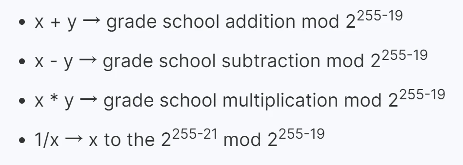 唯一的问题是 ED 25519 使用由 2 ^(255-19)定义的伽罗瓦域。可以将域元素视为从 0 到 2 ^(255-19)的数字。基本运算如下: