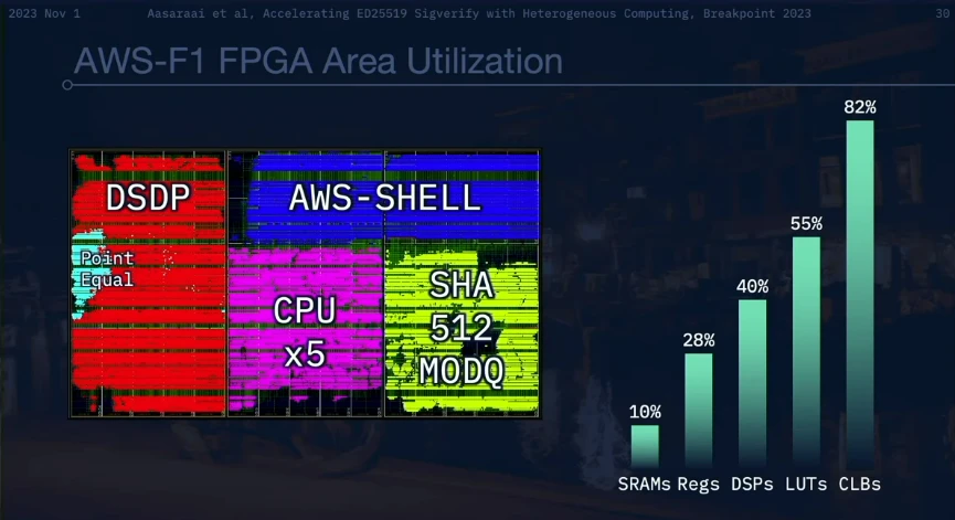 团队在 Breakpoint 2022 展示了 Firedancer 的 ED 25519 签名验证过程。该过程涉及多个阶段,包括在纯 RTL 流水线中进行 SHA-512 计算,并在自定义 ECC-CPU 处理器流水线中进行各种检查和计算。基本上,Firedancer 团队为他们的自定义处理器编写了一个编译器和汇编器,从 RFC(请求评论)中获取了 Python 代码,使用运算符重载的对象来生成机器代码,然后将机器代码放在 ECC-CPU 之上。