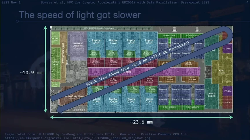 以 Intel Core i 9 13900 K CPU 为例。它拥有 24 个 x 86 核心,基础时钟频率为 2.2 GHz,最高睿频时钟频率为 5.8 GHz。最坏的情况是光线需要在 CPU 内总共传播约 52.0 毫米的距离。CPU 的曼哈顿距离(即沿直角轴测量的两点之间的距离)约为 73.6 毫米。在 CPU 的最高睿频时钟频率 5.8 GHz 下,光线可以在空气中传输约 51.7 毫米。这意味着在单个时钟周期内,信号几乎可以在 CPU 的任意两点之间完成一次往返。