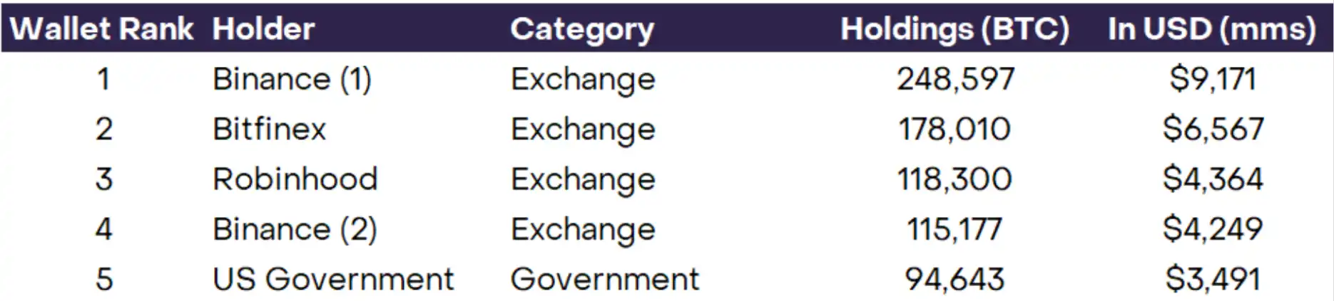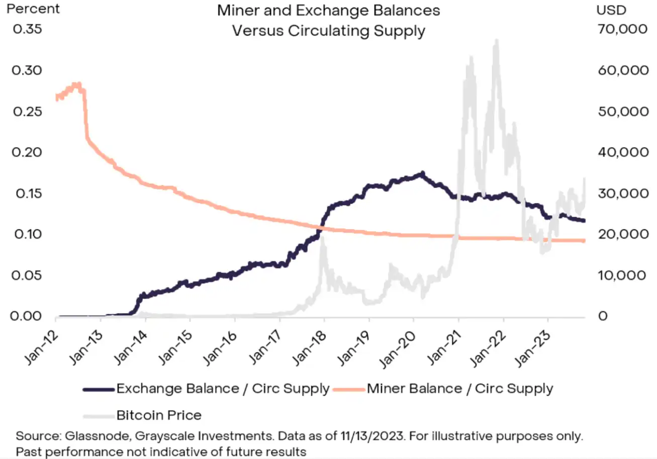 注:通常,交易平台持有多个钱包/地址,这就是为什么 Binance 在这里出现多次。来源:Bitinfocharts、Grayscale Investments。截至 2023 年 11 月 14 日的数据和持仓以美元计。本图表中比特币价格为 36, 891 美元。
