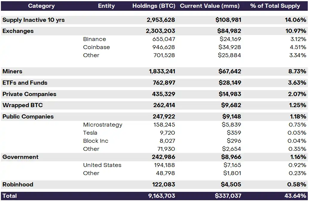 大约 40% 的比特币所有权属于可辨识的类别,包括交易平台、矿工、政府、上市公司的资产负债表以及休眠的供应。
