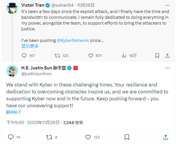 对于这份声明,Kyber 联合创始人兼 CEO Kyber VictorTran 表达了自己的态度:“漏洞利用攻击已经过去几天了,我仍然全力以赴,与团队一起尽我所能,想要将攻击者绳之以法......认识我的人都知道,我不会放弃,也不会停止支持所有用户资金追回的努力”,并表示明天(12 月 1 号)将在 Kyber Network 官方账号发表有关声明。