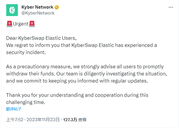 11 月 23 日,KyberSwap 遭受了攻击,包括 ETH 主网、 Base 、 Arbitrum 多个链在内价值约 4800 万美元的加密资产被盗,Kyber 官推也发表声明,表示团队正在努力调查情况并建议用户提取资金,同时不要点击任何钓鱼链接和回复私信。