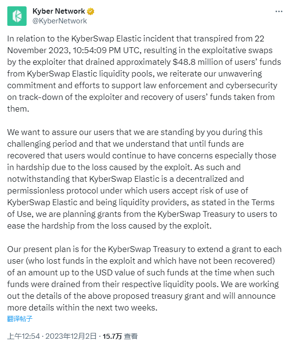 12 月 1 日,KyberSwap 官方账号发表声明,重申将坚定不移的追查攻击者并追回从他们身上夺走的用户资金,同时计划通过 KyberSwap Treasury 向每个在漏洞利用中损失了资金且尚未收回的用户提供一笔补助,最高金额为被盗资金的 100% 。并正在制定上述拟议财政拨款的细节,将在未来两周内公布更多信息。