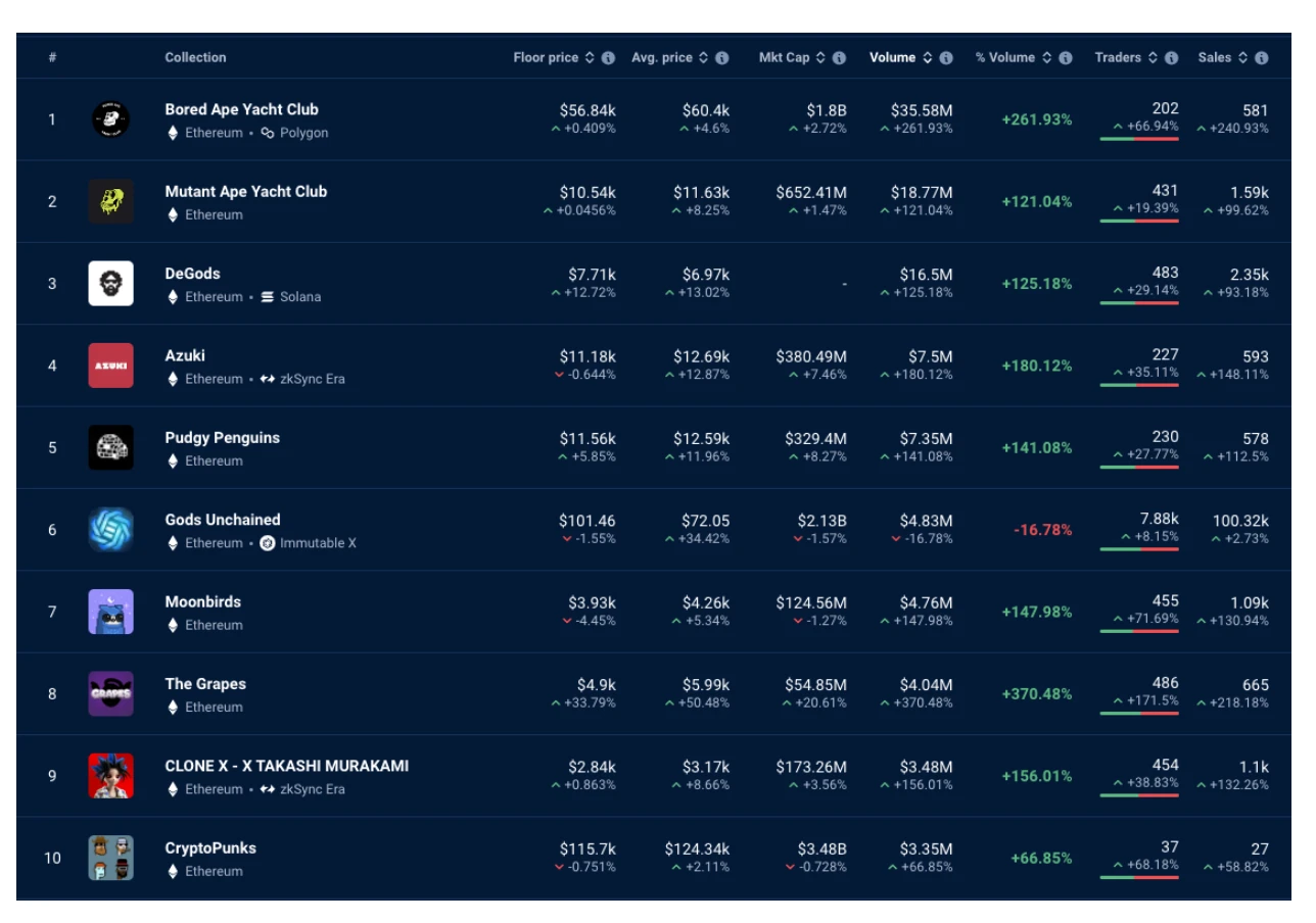 可以预计,已建立的蓝筹 NFT 系列在未来会保持其重要性和价值。值得注意的是,虽然 Crypto Punks 在过去 7 天内占据了最高销售额的位置,但这个原始的蓝筹系列要么排名下降,要么向较低端发展。此外, Ordinals 在 OKX 等市场上体现出重要的交易量,这表明这种趋势正在成为比特币生态系统的一个永久特征。