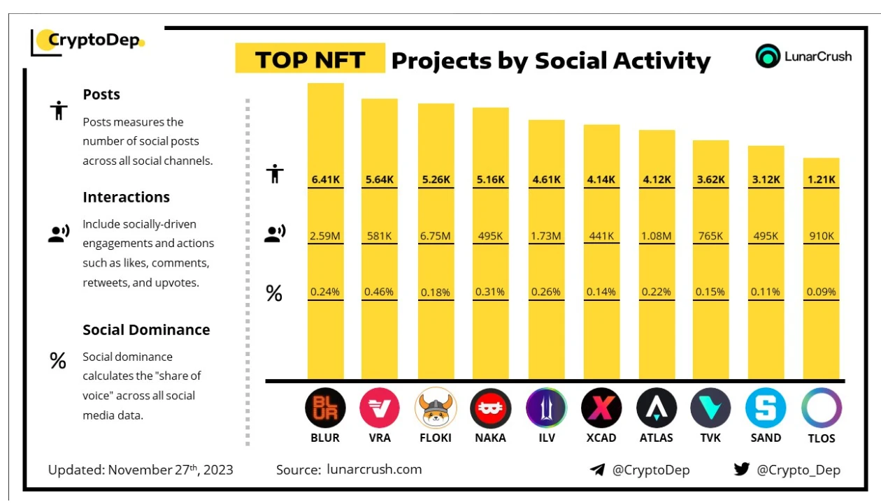 多个项目的社交活动继续创下新高。Blur 是预期之中的,但 Floki、Naka 和 VRA 的加入也值得关注。