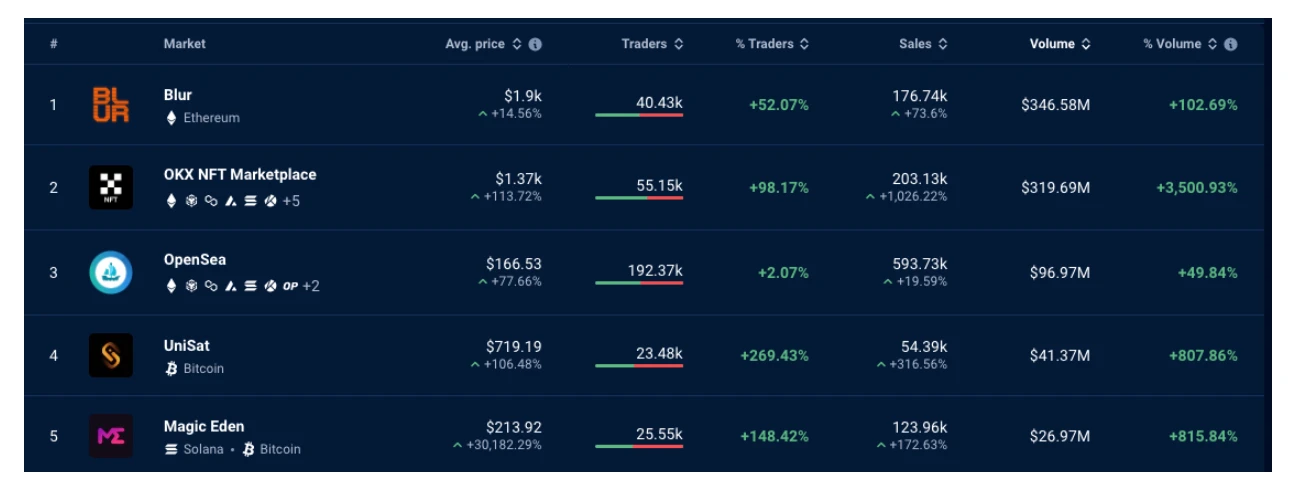 然而,用户应该注意到,Blur 被标记为更高程度的洗钱交易。OKX 的 NFT 市场最近成功推出,交易量大幅增加,其中大部分交易量来自 BTC Ordinals。与此同时,Magic Eden 已经确立自己作为 Solana 上 NFT 的首选市场。