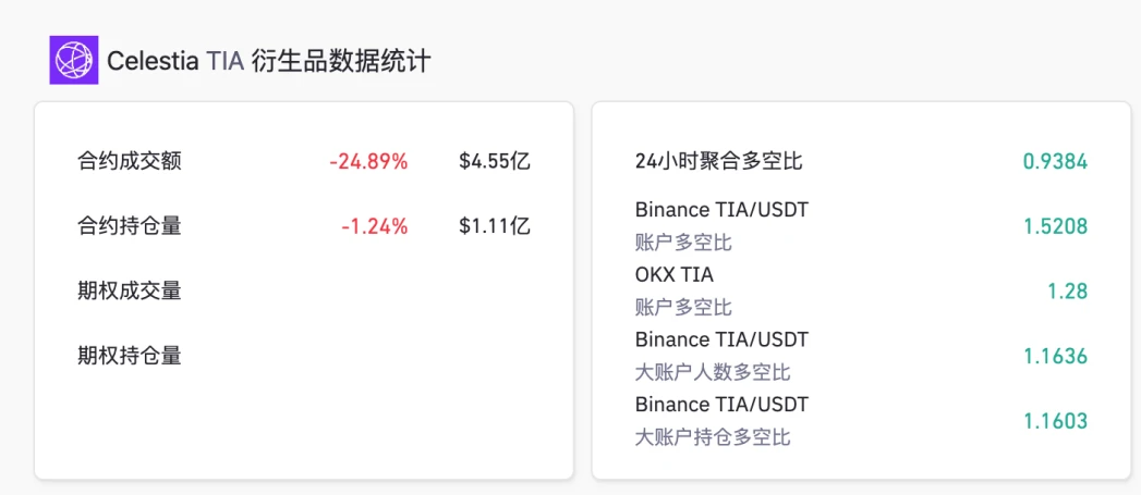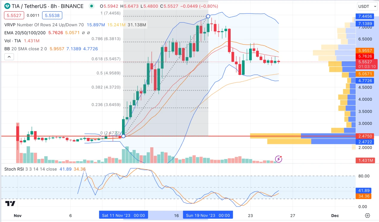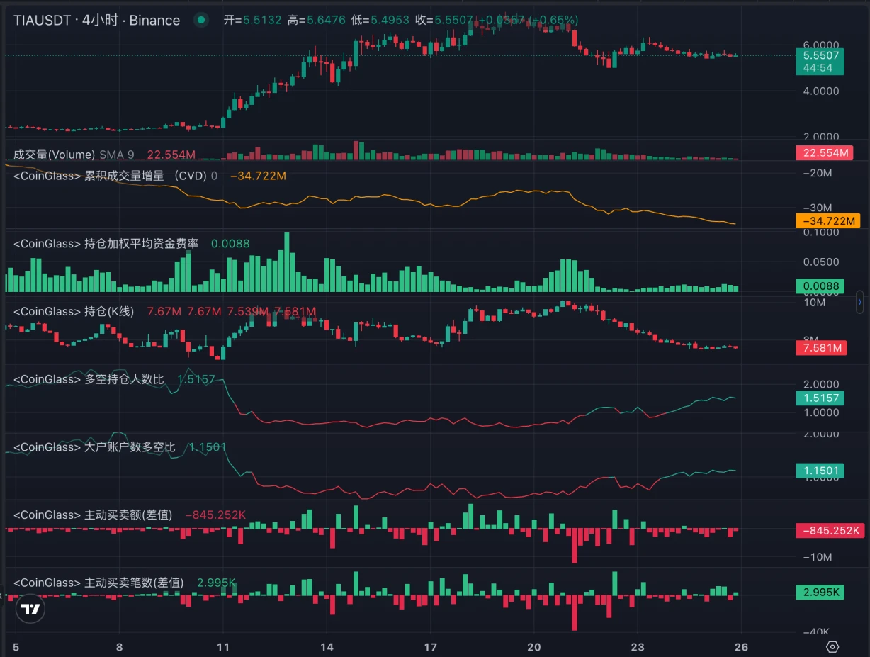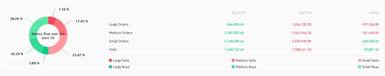 TIA 开盘即上线币安和 OK 等多个交易所,上线后 10 天内在 2.5 附近的位置小幅波动, 11 月 11 日强势拉升后开启上涨行情,最高上涨至 7.4 美元。筹码集中价格在 2.47 美元,其次是 5.9 美元附近。近期交易量有所回落,回到上线初期盘整阶段的水平。当前价格处于斐波纳契回撤 0.618 的位置。币安日内大户净卖出 18.7 万枚,散户净买入 10 万枚。
