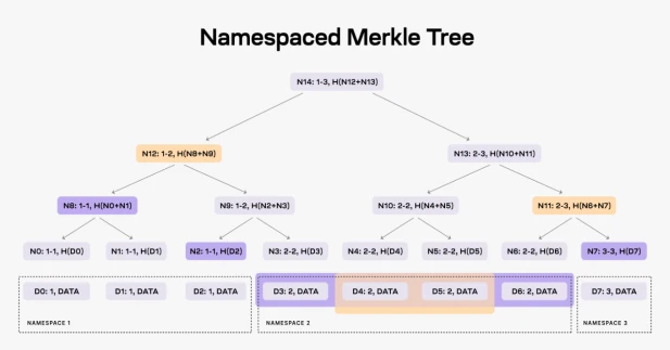 NMT 使 Celestia 上的执行层和结算层仅下载与其相关的交易。Celestia 将区块当中的数据划分为多个命名空间,每个命名空间都对应构建在 Celestia 上的 rollup 等应用,每个应用仅需下载和自己相关的数据从而提高网络效率。