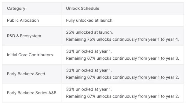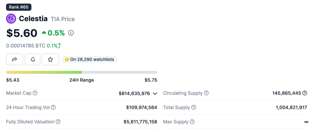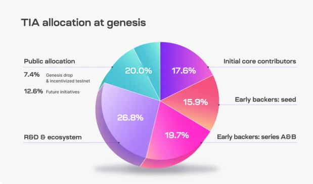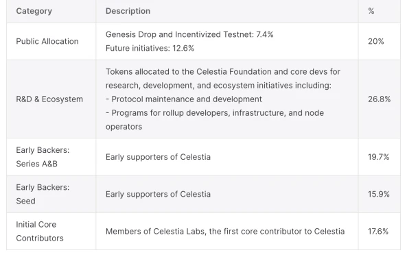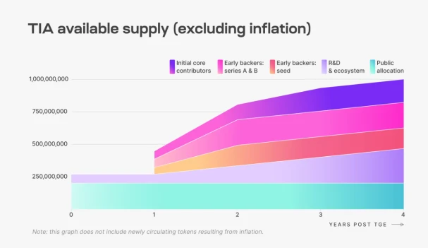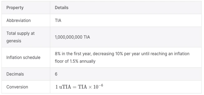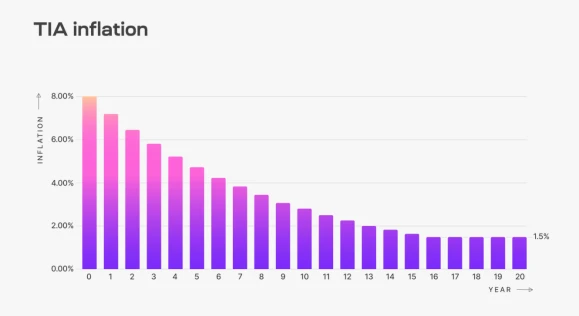 TIA 是 Celestia 的原生代币,总发行量 10 亿枚,第一年的通胀率为 8% ,以后每年减少 10% ,直到年通胀率降至 1.5% 。