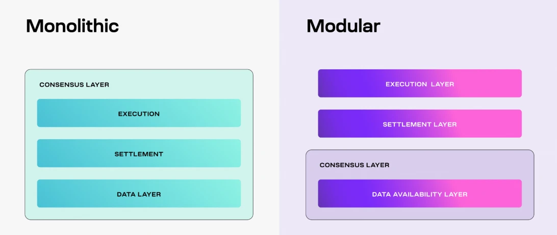 Celestia 是一个专注于数据可用性的模块化区块链项目。相较于单片式区块链独立完成执行、结算、共识和数据可用性,模块化区块链将这些功能在多个专用层之间解耦,作为模块化堆栈的一部分,类似乐高的结构为每个模块提供了更好的灵活性和可拓展性。Celestia 的基础层由共识和数据可用性构成,即共识和数据可用性层,被项目方简称为 DA 层。