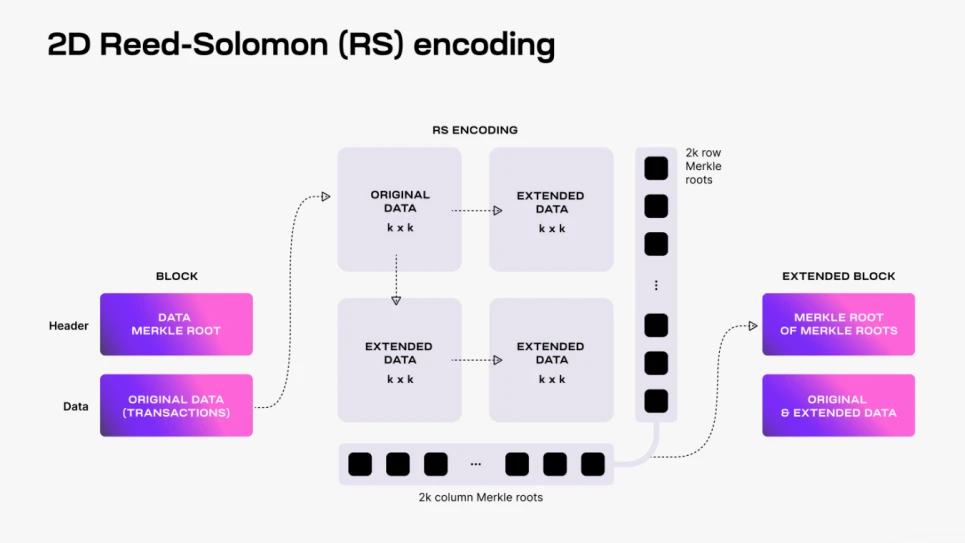 DAS 使轻节点无需下载整个区块的情况下能够验证数据可用性。轻节点因仅下载区块头无法验证数据可用性,Celestia 使用二维 RS 纠删码编码方案(2-dimensional Reed-Solomon encoding scheme)对区块数据进行重新编码以实现轻节点的 DAS。数据可用性采样(DAS)的工作原理是让轻节点对小部分块数据进行多轮随机采样。随着轻节点完成更多轮的块数据采样增加数据可用的信心。一旦轻节点成功达到预定的置信水平(例如 99 %)就认为数据可用。