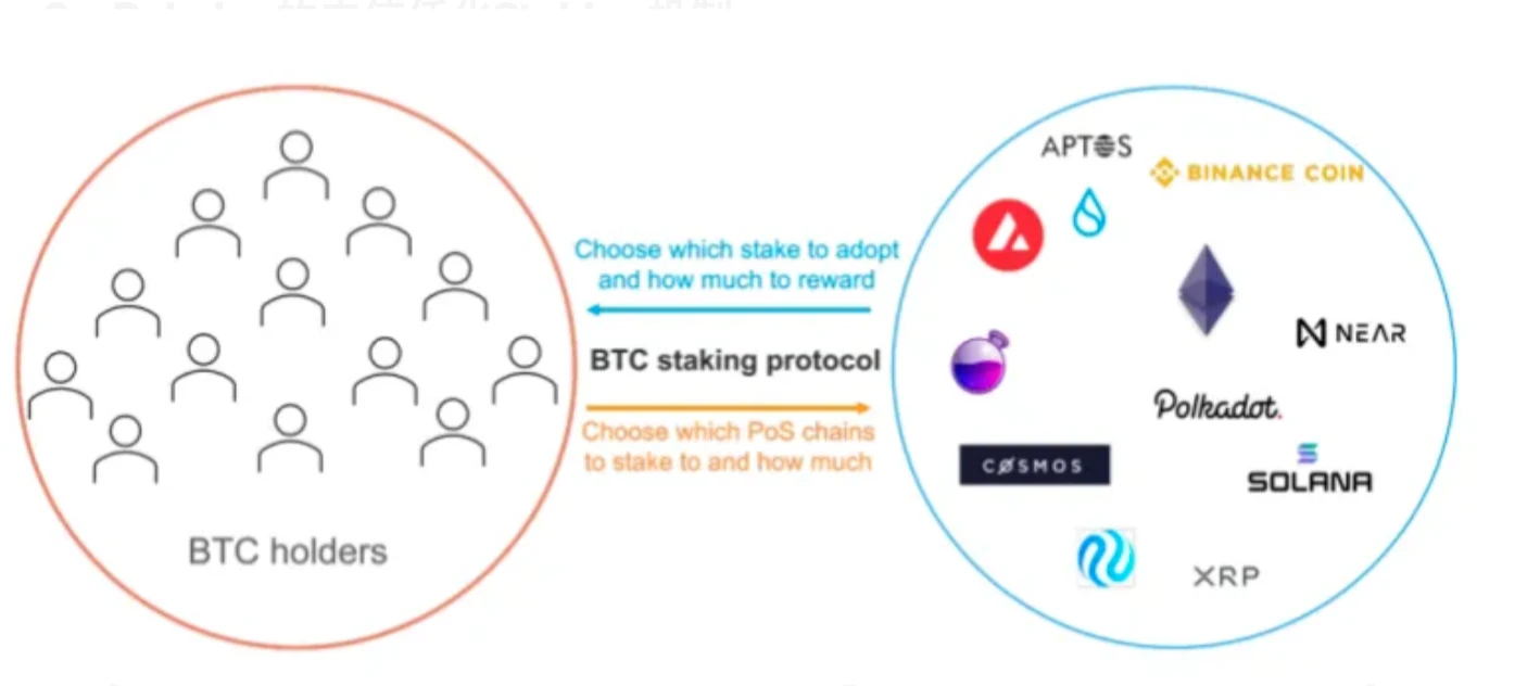 横向可以将BTC质押在不同的pos链来拓展BTC的可能性,让比特币可以在其他的POS链产生收益;