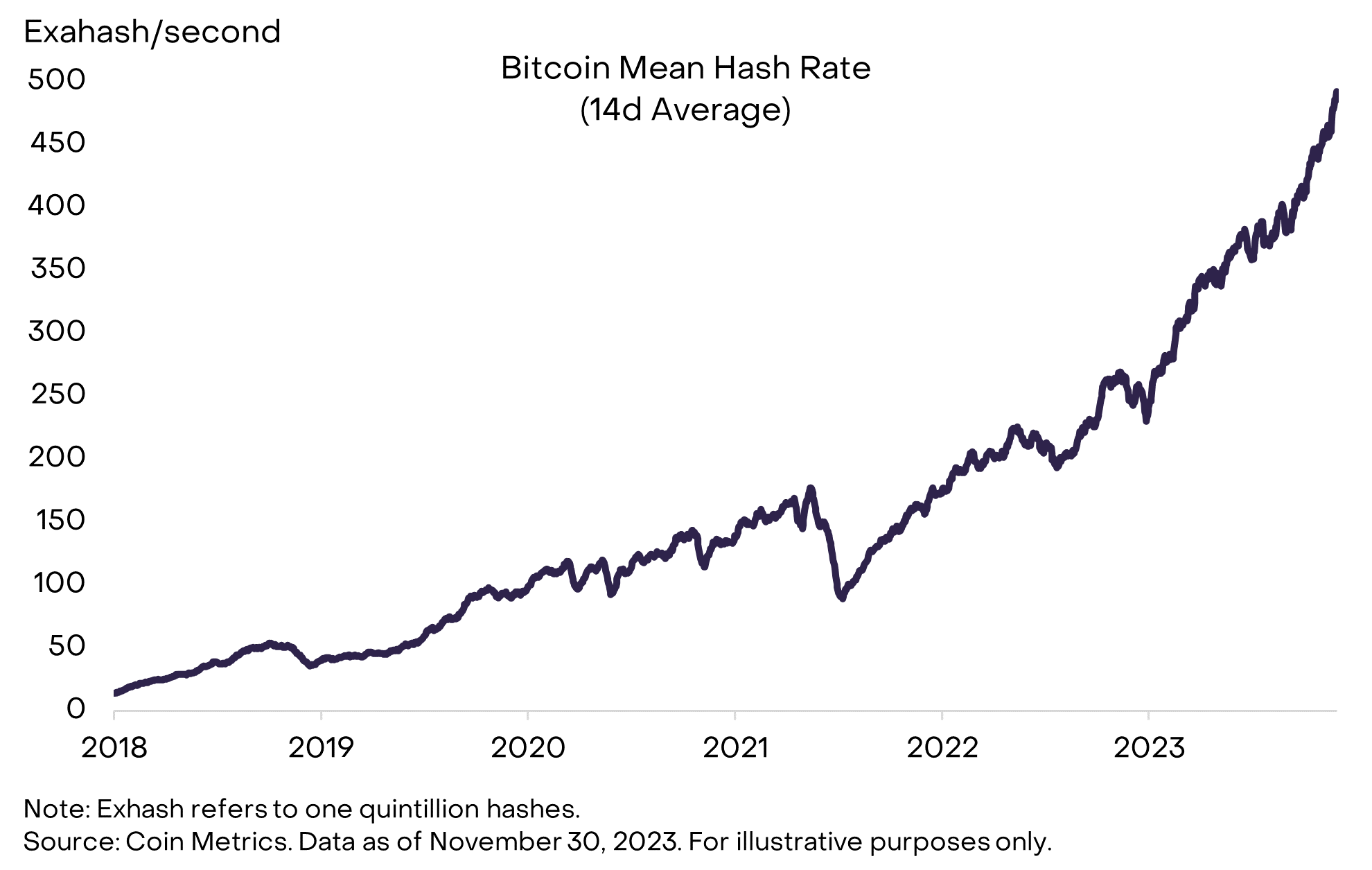 随着估值的走高,加密行业的基本面也有所改善。例如,比特币的哈希率(一种衡量保护网络安全的计算能力总量的指标)在 11 月达到了历史最高水平(表 3)。这一趋势可归因于明年比特币减半之前矿工的升级、更高的代币价格(这使得旧机器能够盈利),以及矿工设备制造商运营的相对较新的机器供大于求。此外,稳定币活动的增加也是加密基本面改善的原因。在过去的一个月里,稳定币总市值增加了 40 亿美元,稳定币交易使用的 Gas 量也有所增加。