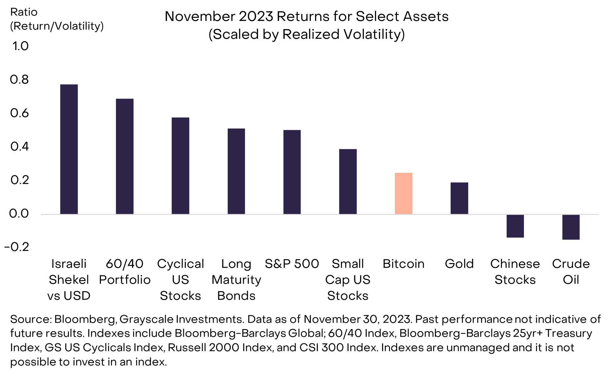 过去一个月,金融市场的各种尾部风险似乎有所下降,有助于此前表现不佳的资产反弹。例如,中东冲突的积极迹象似乎减少了对更广泛的地区混乱的担忧,与以色列经济相关的资产因此反弹(图 1)。同样,在财政部宣布借贷需求的增长小于预期之后,长期国债价格上涨(收益率下降)。消费者价格指数(CPI)也继续下降,这增加了市场对美联储降息和美国经济可能“软着陆”的希望。在波动性调整后的基础上,比特币在本月表现不佳(自 8 月底以来表现优异),但仍上涨 9% (以太币在 11 月上涨了 13% )。