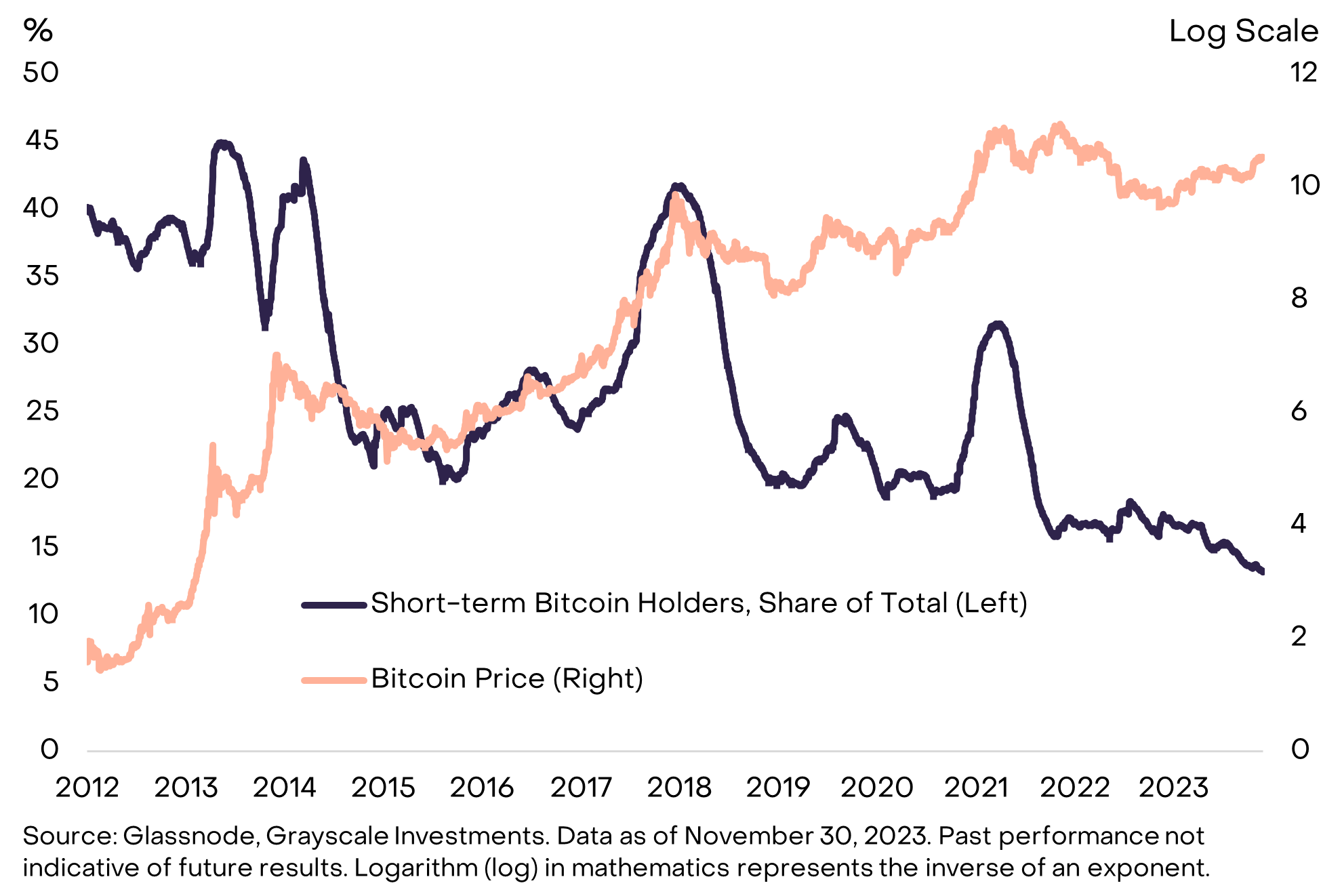 话虽如此,在灰度看来,金融市场和宏观经济状况可能对比特币和其他加密资产有利。在潜在投资者涌入美国现货 ETF 产品之前,比特币的供应相对“紧张”。例如,根据 Glassnode 数据,短期投机者持有的比特币供应份额达到了创纪录的低点(表 5)。同样,灰度的分析也表明,比特币的很大一部分是由长期持有者持有(相关阅读: 灰度揭秘比特币持有者格局:拥有 1 枚以上比特币仅占 2.3% )。明年比特币减半也将限制新代币供应的增长。在灰度看来,缺乏弹性的比特币供应和潜在的新投资者流入的结合应该对估值产生积极影响。