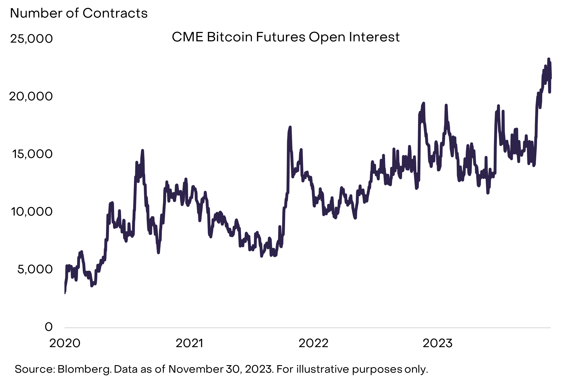 在经历了一段时间的大幅上涨之后,将活跃的加密交易者定位为相对“多头”。例如,在芝加哥商品交易所(CME)上市的比特币期货未平仓合约在 11 月创历史新高,这可能表明市场上的机构活动正在增加(图 4)。与此同时,交易所交易产品(ETP),包括美国的期货产品和海外的现货产品, 11 月实现净流入。灰度估计, 11 月份全球加密货币 ETP 净流入总额为 13 亿美元,全年达 22 亿美元。