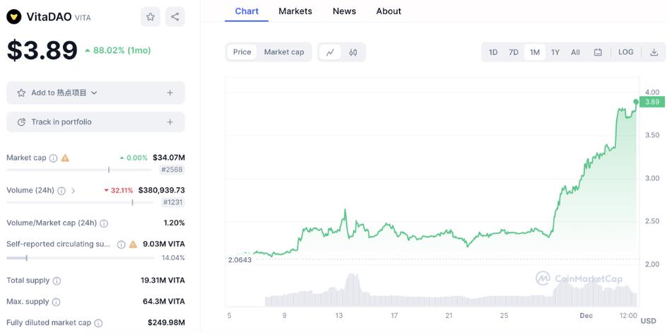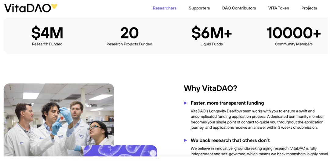 VitaDAO 是一个由$VITA 持有者治理的社区,专注于资助早期的长寿研究。