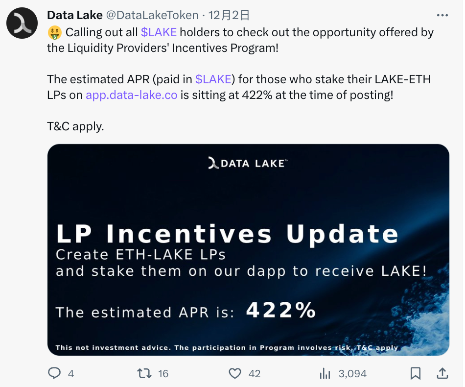 已开放质押池,存入$lake 可以获得至多 422% APR 的回报