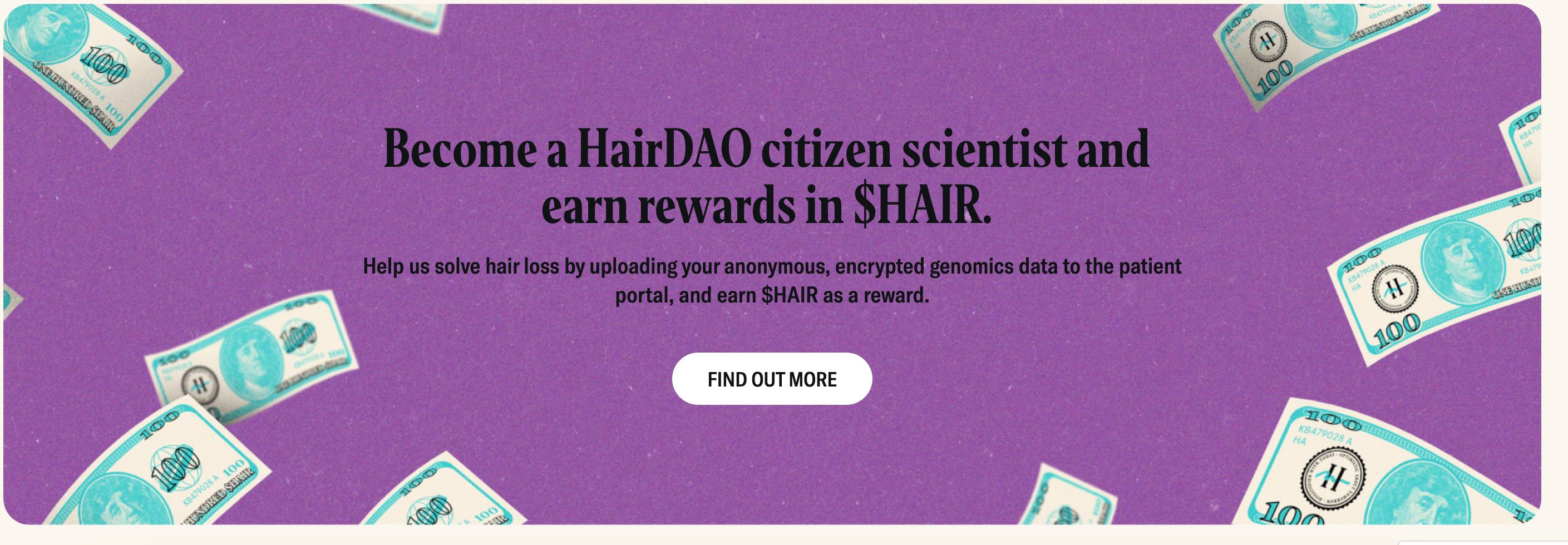 其代币$HAIR 奖励那些帮助解决脱发问题的人。用户可以通过上传他们的匿名、加密的基因组数据来获得$HAIR 作为奖励。