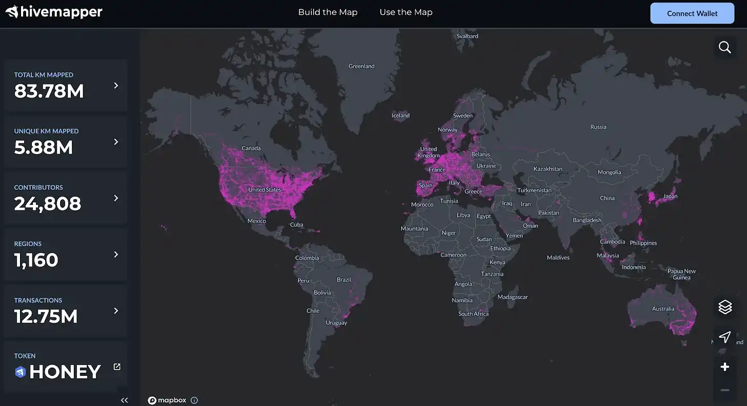 Hivemapper 是 Solana 网络上另一个杰出的 DePIN 项目,旨在创建一个去中心化的「谷歌地图」。基本上,该项目的用户在他们的汽车上安装行车记录仪,并与 Hivemapper 共享实时影像,作为回报而获得 HONEY 代币。然后,该公司使用所有这些分布式数据来构建一个带有应用程序 API 接口的去中心化地图。