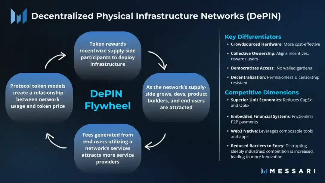因此,我们的第一个任务是注意这一系列项目在原始 Messari 报告中以及这个术语逐渐演变的过程中的概念相似性。其中许多项目都共享一些相似之处,包括集体所有权、分布式基础设施成本,随着更多用户进入生态系统,规模经济逐渐扩大。事实上,这可以在 Messari 的 DePIN 飞轮中概括,解释了这是通过代币激励来促成的。