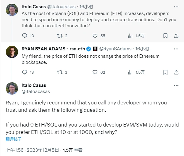 Ryan 认为大可以在各类 Layer 2 上进行开发,并表示“ETH 的价格不会改变以太坊区块空间的价格”;而 Italo 则反呛道,“你可以去问任何开发者,看看他们是更喜欢价格为 0 美元的 ETH/SOL 还是价格为 1000 美元的 ETH/SOL”。