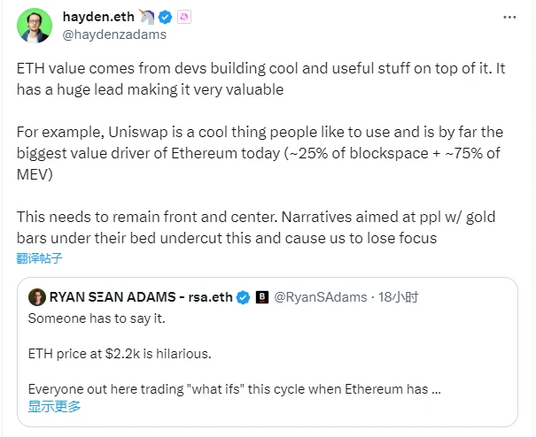 其中 Uniswap 创始人 Hayden Adams 的回答能够代表大多数 Ryan 支持者的心声。他表示,ETH 的价值来自于开发者在其基础上构建酷炫且有用的东西。它具有巨大的领先优势,因此非常有价值。他还以 Uniswap 为例,表示“Uniswap 是人们喜欢使用的一个很酷的东西,并且是迄今为止以太坊最大的价值驱动因素(约 25% 的区块空间 + 约 75% 的 MEV)”。