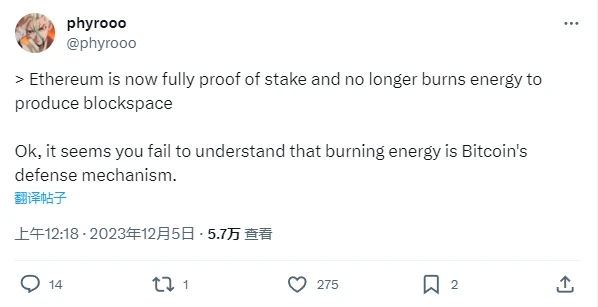 当然,Ryan 的评论区也不乏有比特币死忠支持们的反对声,用户 @phyrooo 表示:“以太坊现在已经完全实现了 POS,不再燃烧能量来产生区块空间了......好吧,看来你不明白燃烧能量是比特币的防御机制。”