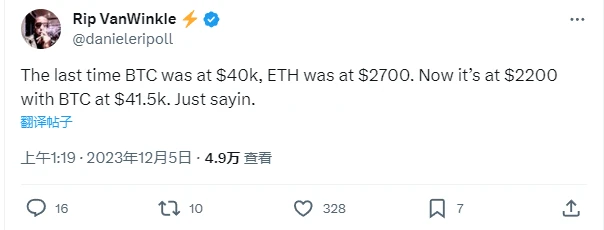用户 @danieleripoll 则用另外一种方式反驳了 Ryan 的观点:“上次 BTC 价格为 4 万美元时,ETH 价格为 2700 美元。现在 ETH 的价格为 2200 美元,而 BTC 的价格则为 41500 美元。”