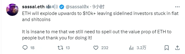 The Daily Gwei 创始人 @sassa l0 x 则十分乐观的表示:“ETH 将飙升至 1 万美元以上,让观望的投资者陷入法货和垃圾币的泥潭中。在我看来,我们仍然需要向人们阐明 ETH 的价值支撑在何处,这太疯狂了,但感谢你们这样做!”