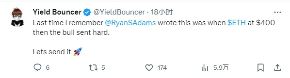 用户 @YieldBouncer 甚至已经开起了香槟:“上次我记得 Ryan 写类似的话的时候,ETH 的价格是 400 美元,然后牛市来了。起飞!”