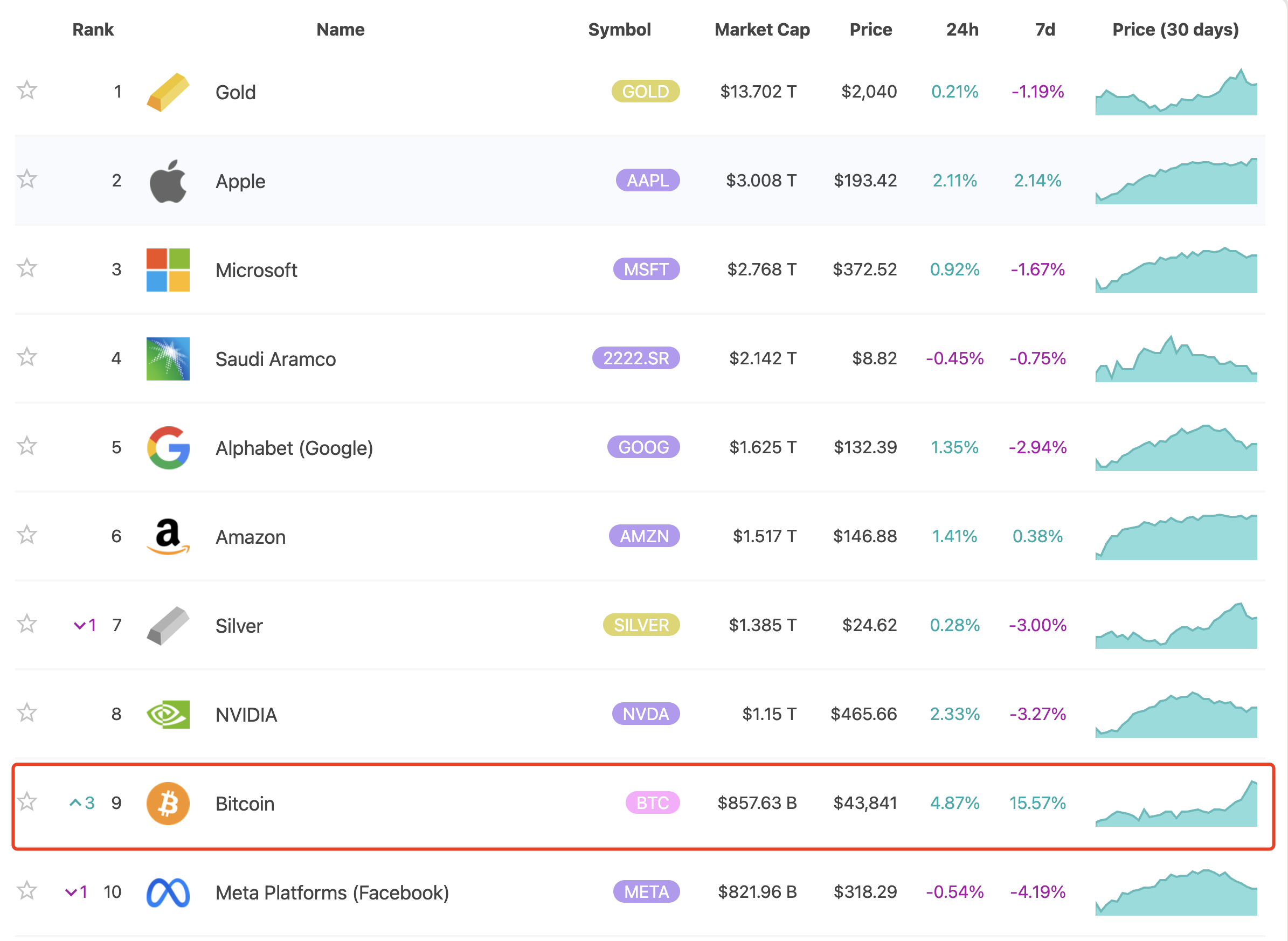 比特币市值达到8582亿美元,超越Meta,重回全球资产排行榜第9位